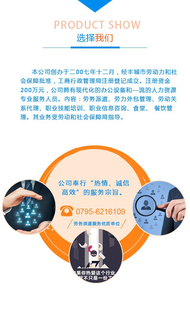 本公司创办于二00七年十二月,经丰城市人力资源和社会保障局批准,市场监督管理局注册登记成立。注册资金200万元,公司现有员工2000余人,公司拥有现代化的办公设备和一流的人力资源专业服务人员。业务含概:劳务派遣、劳务外包管理、劳动关系代理、职业技能培训、职业介绍、职业信息咨询、人力资源社会保险事务代理、食堂、餐饮管理。其业务受丰城市人力资源和社会保障局指导,公司奉行“热情、诚信、高效”的服务宗旨。
