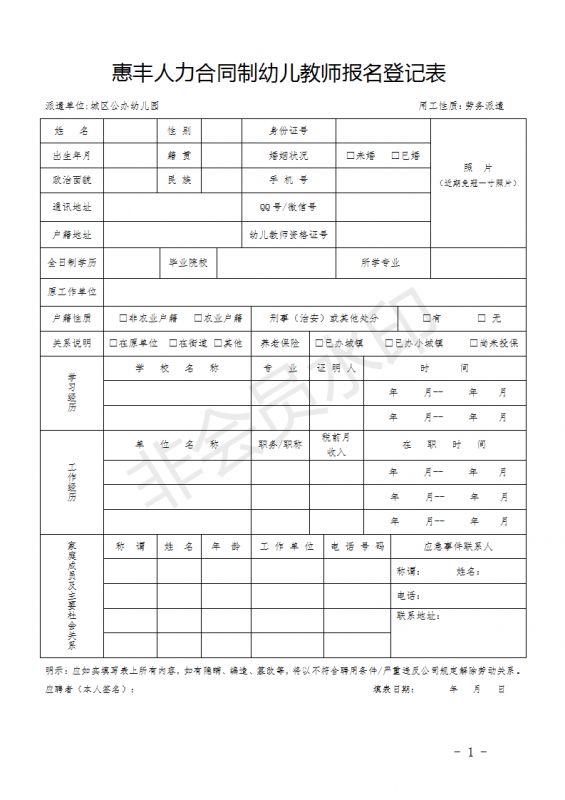 符合应聘条件的人员自行登陆丰城政府网和惠丰劳动力资源开发有限公司网站,下载《惠丰人力合同制幼儿教师报名登记表》(见附件),如实填写,本人现场诚信报名。